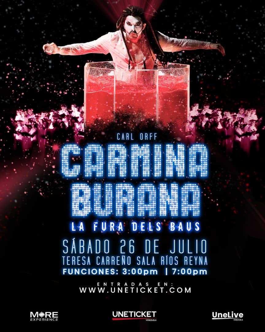 La Fura Dels Baus llega a Venezuela para presentar en el Teatro Teresa Carreño la impactante Carmina Burana, reconocida obra del compositor alemán Carl Orff (1895-1982), en un espectáculo incomparable que no te puedes perder. La cita es el sábado 26 de julio con dos únicas funciones, una a las 3:00 p.m. y otra a las 7:00 p.m.