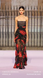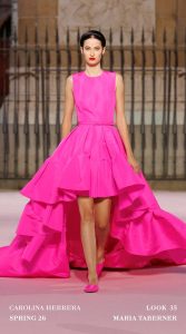 Las piezas de la reciente colección de Carolina Herrera presentaron una visión renovada para la Primavera-Verano 2026, transmitiendo colores audaces a través el azafrán al rojo Herrera, que convive con el burdeos profundo, el rosa eléctrico de los atardeceres madrileños, violetas intensos y blancos puros en fondos amarillos. Gordon se inspiró tanto en los cielos pintados por Goya como en la energía cinematográfica de Almodóvar.