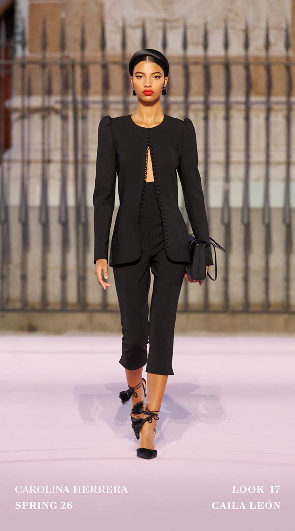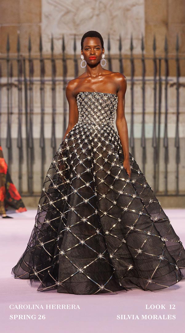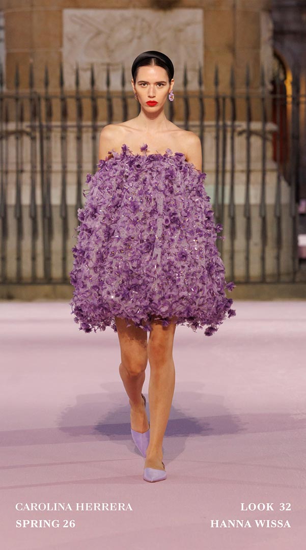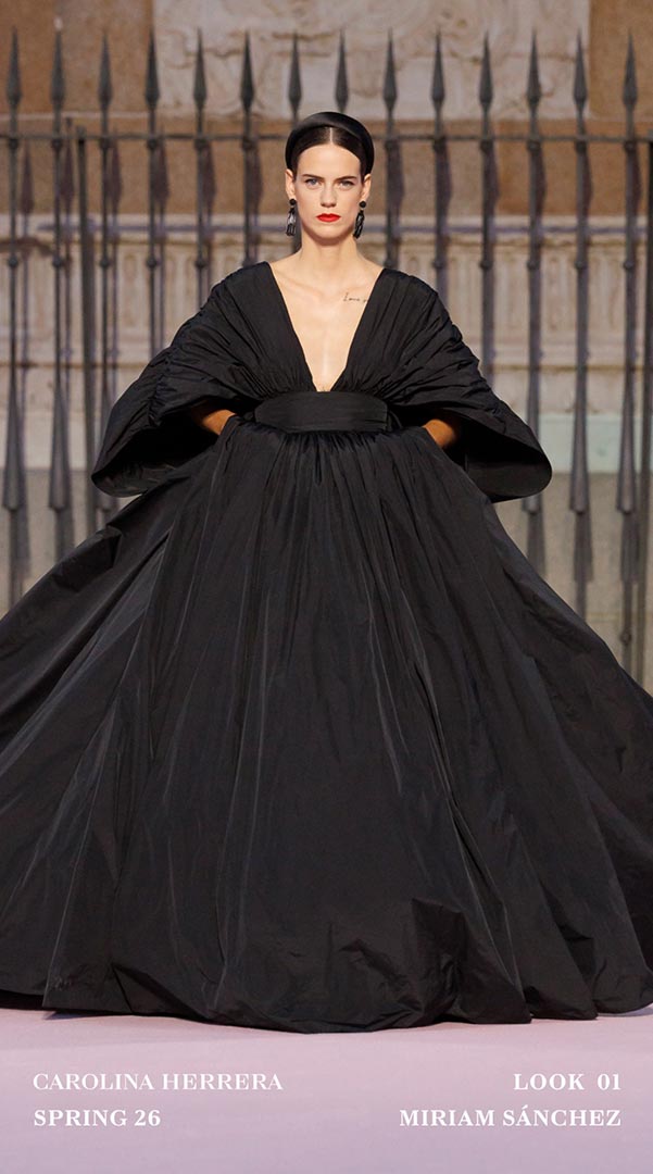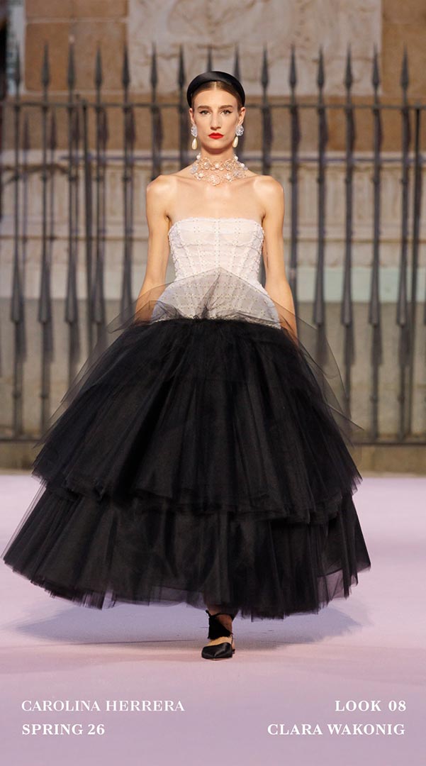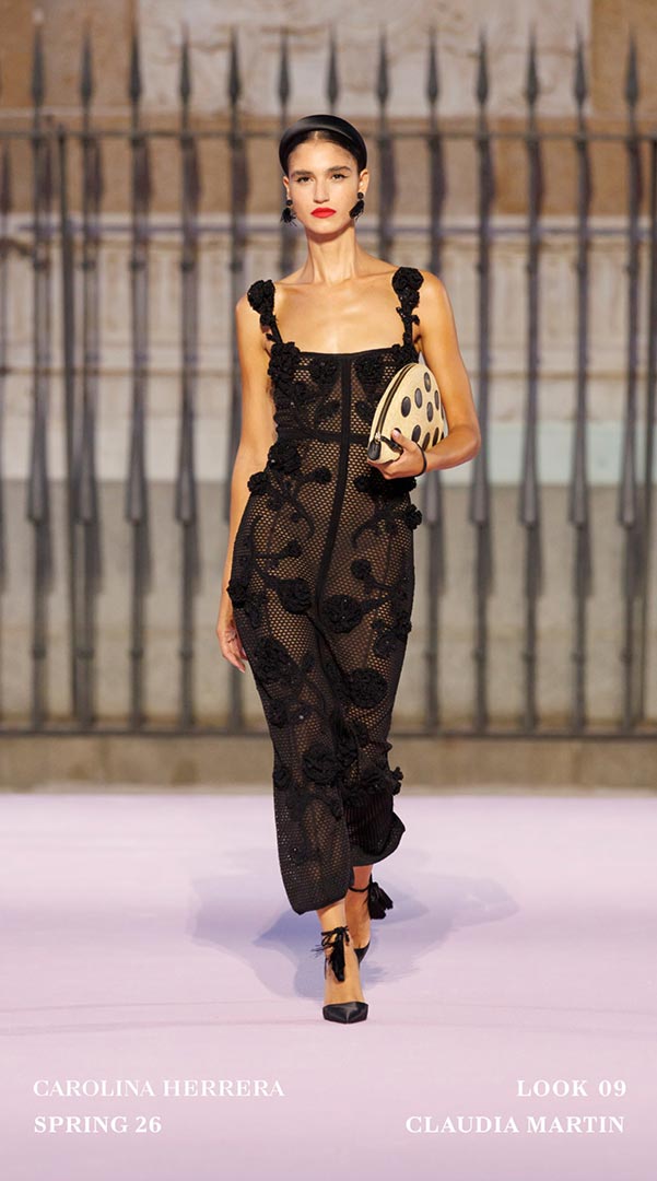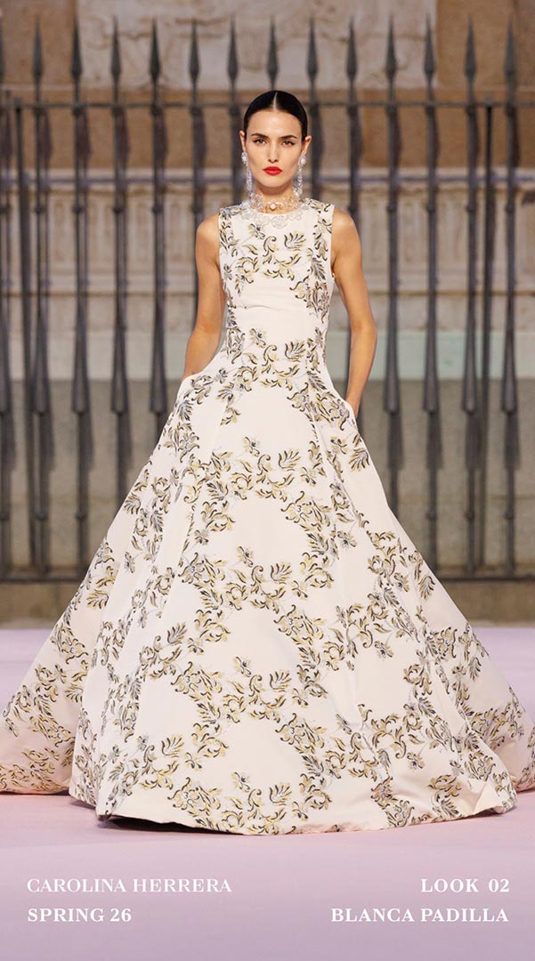 Como en otras ocasiones cuando Carolina Herrera sale de la Gran Manzana, la casa enriqueció la propuesta Primavera-Verano 2026 colaborando con artesanos locales. Sybilla, aportó tres vestidos que dialogaron con el ADN de la firma mediante su inconfundible “hilo invisible”; Palomo Spain transformó la camisa blanca Herrera con cuellos con volantes. En joyería, Andrés Gallardo trabajó con porcelana en broches y colgantes inspirados en el clavel.