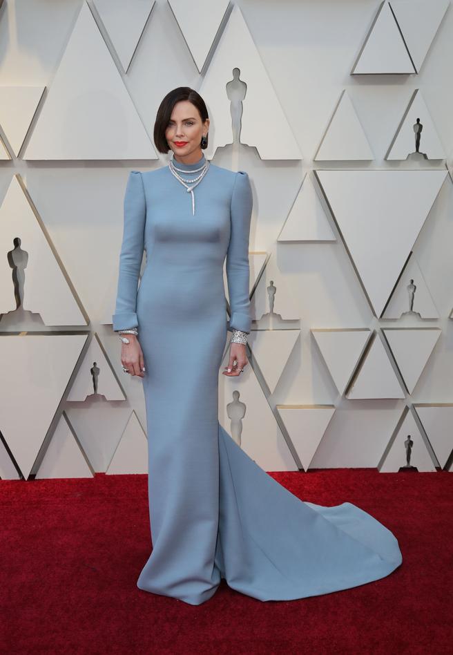 Charlize Theron, que estrenaba color de pelo, estaba radiante con este diseño azul de Dior con cuello perkins, manga larga con volumen en los hombros y falda acabada en cola. El vestido era todavía más espectacular por la espalda gracias a su gran abertura con el que la actriz consiguió aportar un toque sensual a su estilismo, que completó con joyas de la colección ‘Serpenti’ de Bvlgari.