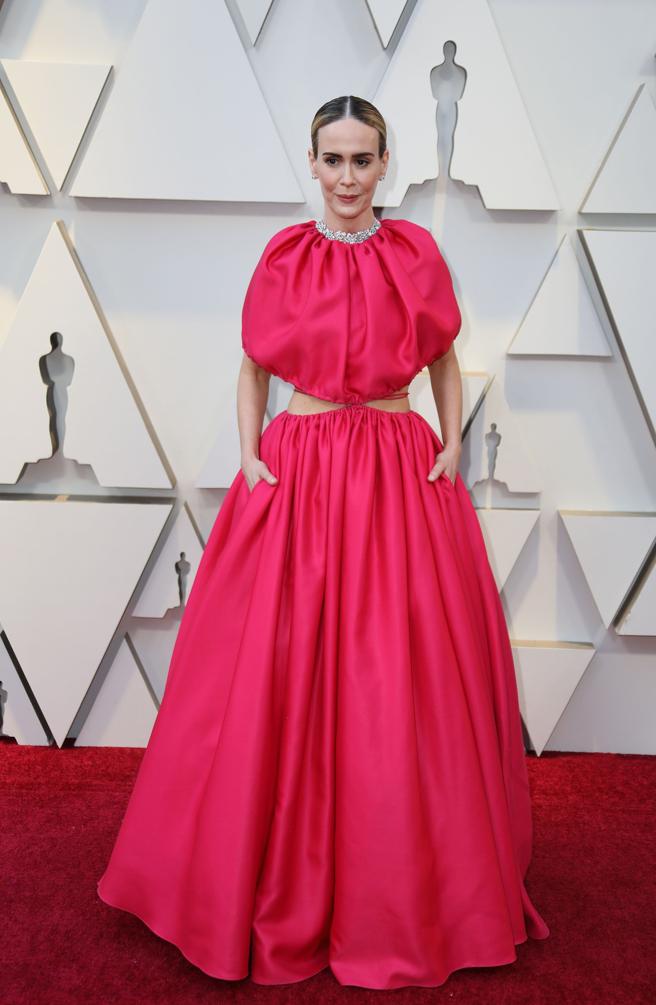 Sarah Paulson fue una de las invitadas que se sumó al color de la noche, el rosa, con este impactante vestido de Brandon Maxwell que parecía estar dividido en dos. Por un lado, el cuerpo con escote caja y ‘cut outs’ en la zona del abdomen con el que marcaba figura, mientras que la falda estaba llena de volumen. Un estilismo con el que la actriz consiguió llamar la atención.
