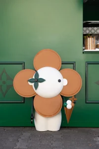 La juguetona mascota de Louis Vuitton, Vivienne, da la bienvenida a los visitantes en una mezcla perfecta de diseño y savoir-faire. Cada elemento está meticulosamente elaborado: tazas, tarrinas, servilletas y bolsas de la compra se personalizan con un estampado único creado para la ocasión. Los barquillos redondos se convierten en flores que decoran cada helado.
