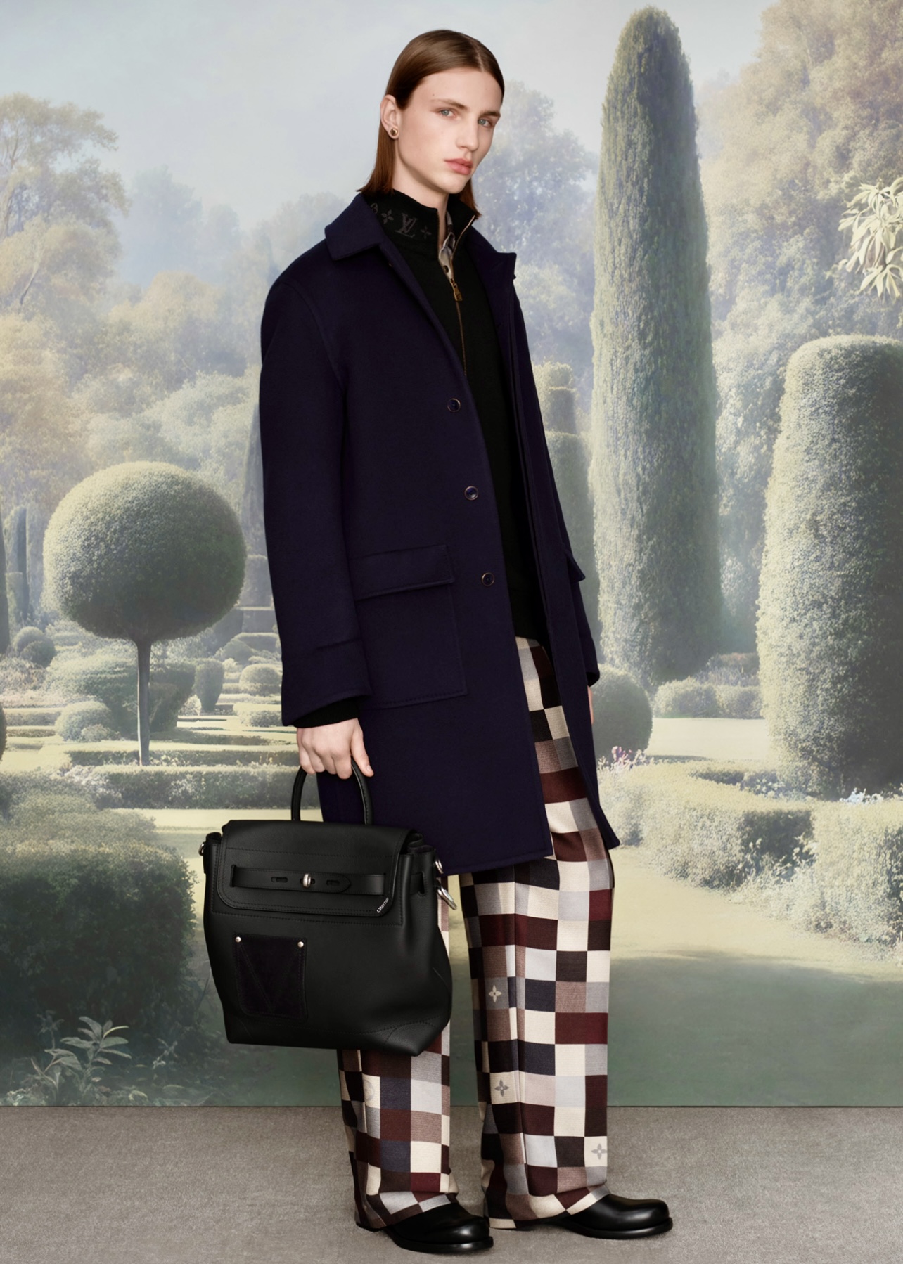 Concebida en dos partes, el primer capítulo de la colección sitúa al dandi de Louis Vuitton en la naturaleza de la campiña inglesa, mientras que el segundo capítulo se adentra en la histórica casa de campo. Inspirándose en el ocio bucólico, la primera entrega crea un vestuario otoñal de transición con los colores naturales del paisaje y el clima británicos. La sastrería tradicional y los materiales del vestuario campestre se urbanizan y se convierten en dandis en cuanto a corte y confección. Imaginando las actividades nocturnas que se suceden, la segunda entrega evoca la comodidad de las residencias campestres en sofisticadas expresiones invernales encarnadas por la relajada formalidad propia del entorno. Amplificadas en elegancia, las nobles siluetas dandis se cortan a partir de telas arraigadas en los códigos de los trajes de noche y se inspiran libremente en los interiores y la decoración de las casas de campo.