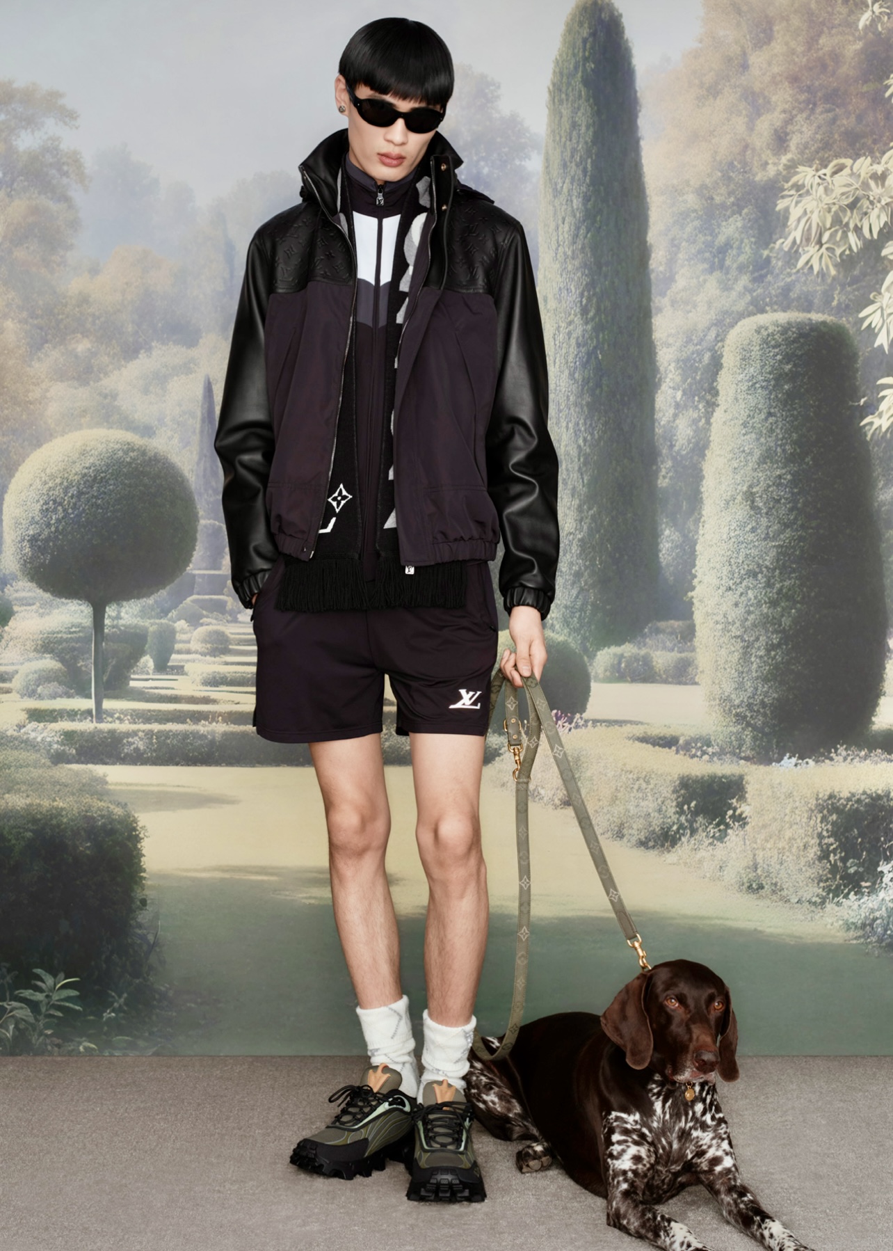 Un verde bosque pinta el Monogram Surplus, un estampado de camuflaje empleado en una chaqueta de lona con capucha de cuentas, un blusón de jacquard de nailon y un traje vaquero estampado y entallado. En homenaje al clima británico, el motivo Monogram Waterdrops aparece en un cortavientos reversible y en un conjunto de seda, mientras que sus gotas también embellecen una chaqueta Harrington de denim azul en hotfix brillante. El gráfico LV Animal imita el estampado LV Blason