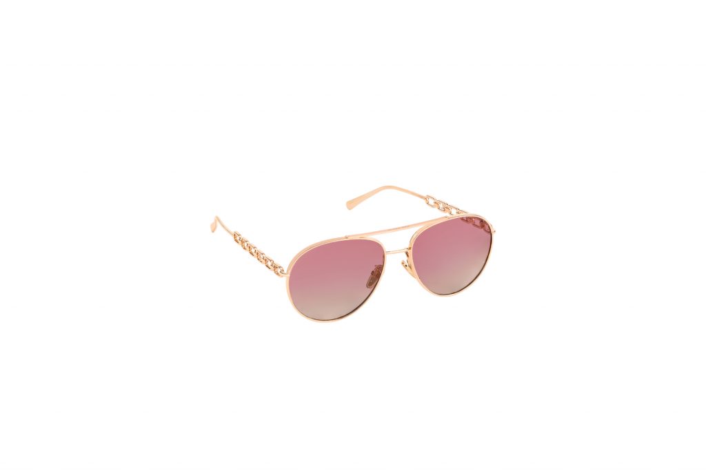 Los códigos de Louis Vuitton se reflejan en toda la colección, demostrando el savoir-faire excepcional de la Maison. Se ha diseñado específicamente una impresionante joya de la firma en metal reluciente para que se ajuste a la bisagra de las gafas y complemente las patillas de gran tamaño. Una fina cadena dorada, discretamente grabada con el Monogram, se ha diseñado para actuar como patillas y aportar un brillo favorecedor al rostro, mientras que un modelo atemporal disponible en dos colores, negro y que revela flores Monogram, como si estuvieran encerradas en el acetato del marco.