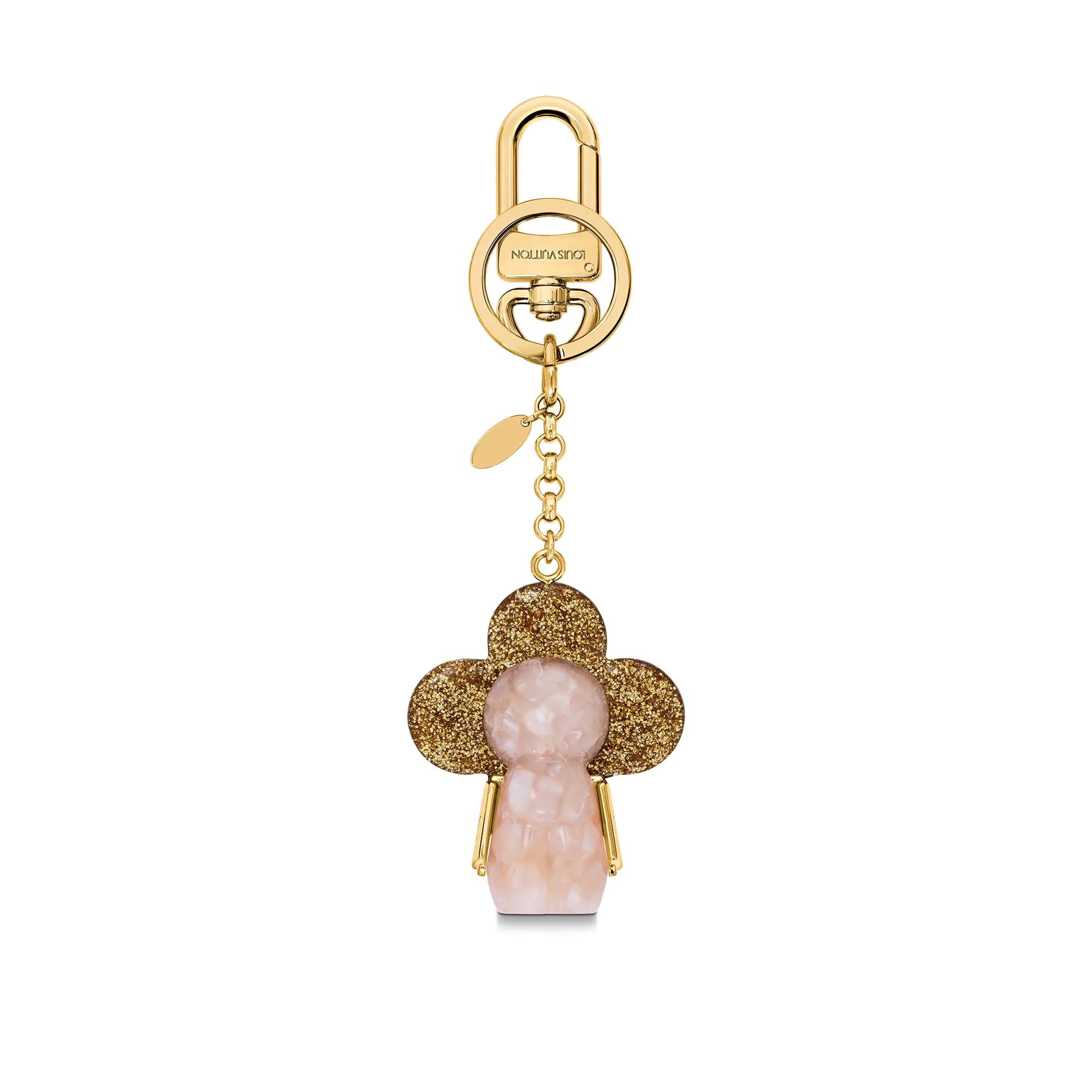 una variedad de materiales preciosos. Inspirándose en las dos flores Monogram, respectivamente redondas y puntiagudos, Vivienne se para de pie con sus ojos de diamante bien abiertos, mientras que sus brazos grabados en Louis Vuitton permanecen móviles, libres para balancearse con indiferencia de lado a lado.