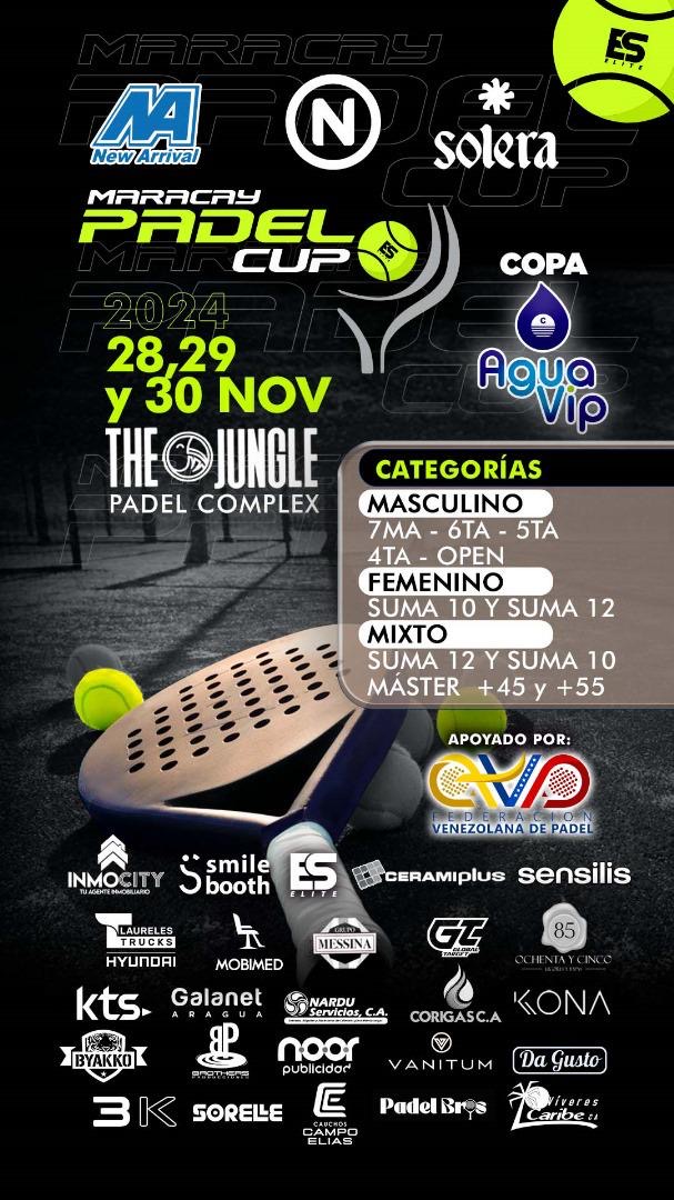 La segunda edición del Maracay Pádel Cup, Copa Agua VIP 2024, reunirá a los más destacados nombres de la disciplina en el estado para un encuentro que promete adrenalina, talento y mucha emoción. El torneo se celebrará desde el jueves 28 de noviembre y el sábado 30 de Noviembre en The jungle Pádel Complex en la ciudad de Maracay. El evento contará con la participación de unos 150 competidores entre damas y caballeros en distintas edades y categorías.