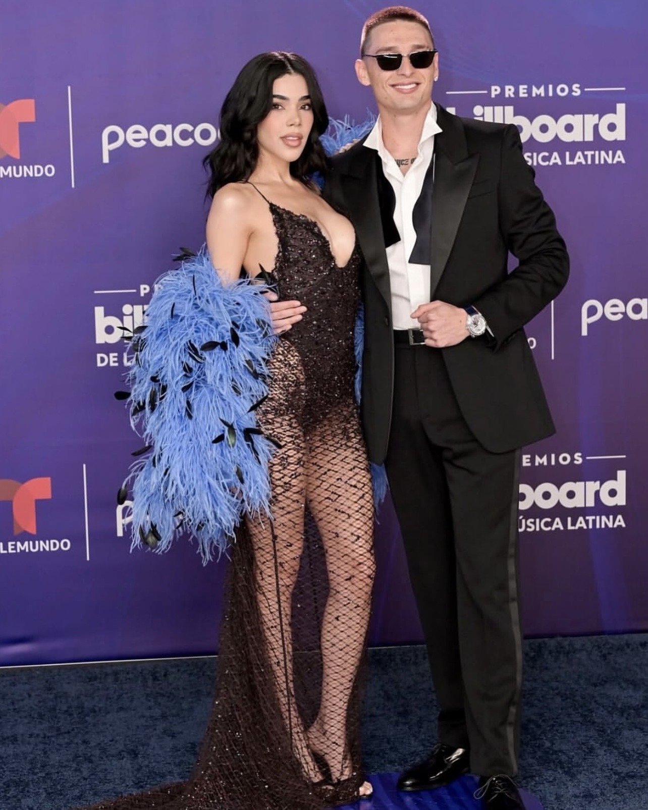 Peso Pluma, uno de los más nominados y quien fue distinguido con el Premio Vanguardia, llegó vestido de esmoquin, con la camisa abierta y un lazo desamarrado. En su brazo estaba su pareja y también artista Kenia OS, quien llevaba un ‘body’ de pedrería y una falda de red negros, al que le dio color con una boa azul rey.