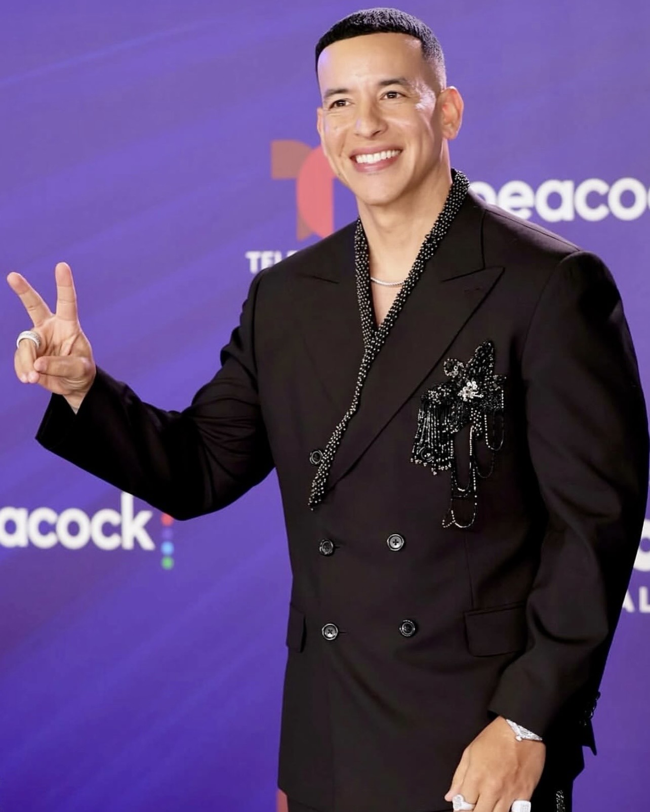 También de negro y elegante apareció Daddy Yankee,con un traje de chaqueta y pantalón con terminaciones de canutillos negros y una hermosa flor bordada con aplicaciones en el bolsillo.