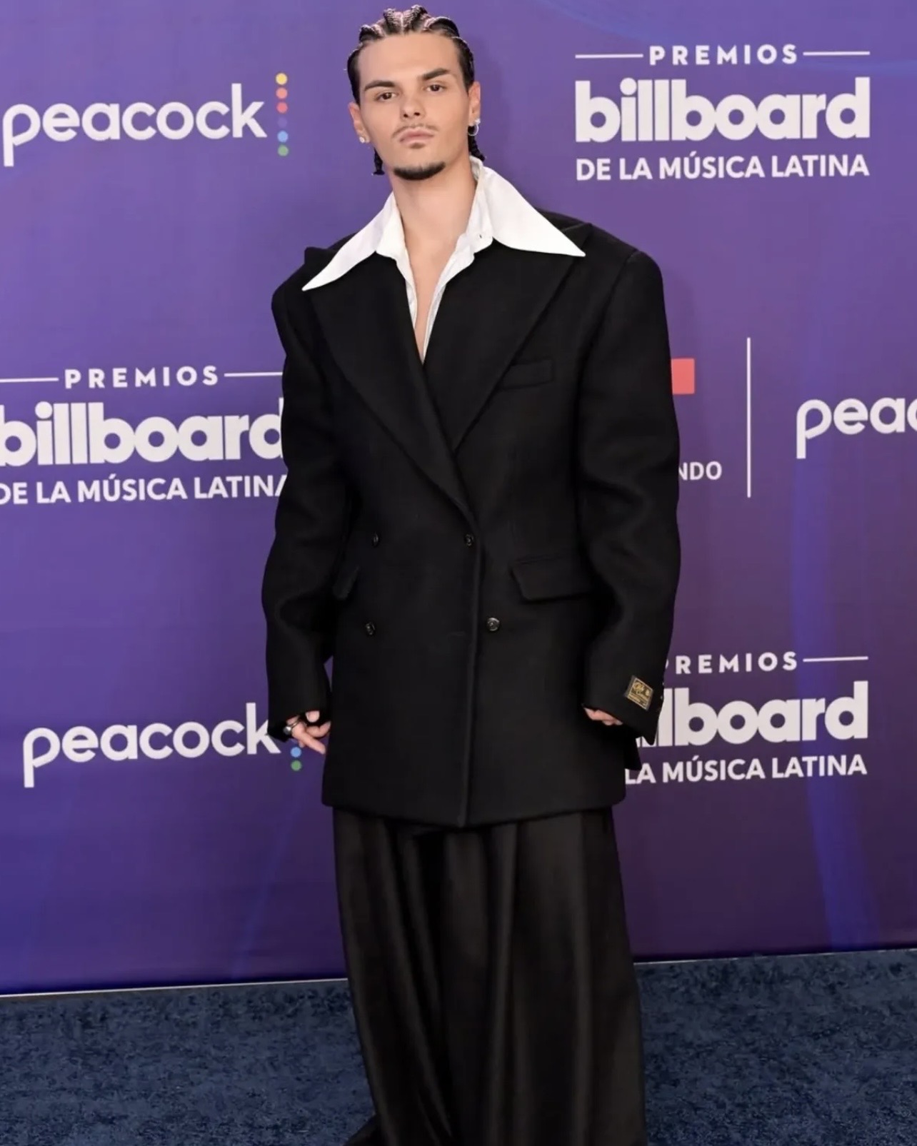 El cantautor español Abraham Mateo logró combinar el riesgo con la elegancia clásica con un traje negro de gran tamaño sobre una camisa blanca, en un conjunto de estilo maximalista que destacó por el cuello amplio, los pantalones anchos y las chaquetas de proporciones exageradas, acorde con las tendencias actuales.