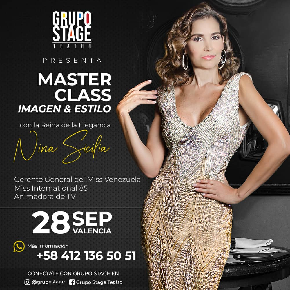 El próximo sábado 28 de septiembre, Nina Sicilia, gerente general de la Organización Miss Venezuela, ofrecerá en la ciudad de Valencia una Master Class de dicción, protocolo, pasarela e imagen dirigido a señoras, niñas, niños y adolescentes.