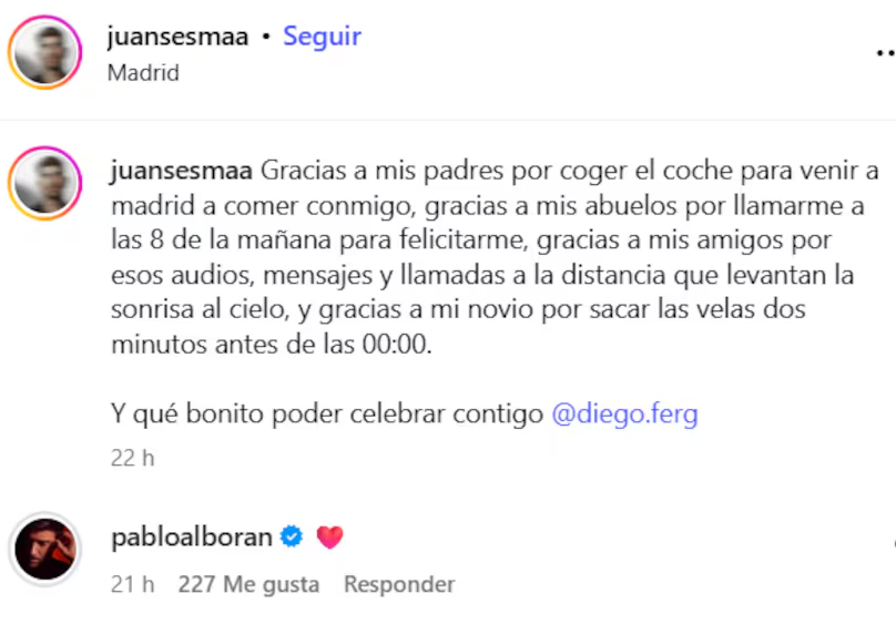 Desde hace meses, los fans notaban coincidencias sospechosamente románticas entre Pablo y el modelo navarro Juan Sesma Garbayo. Fotos en los mismos lugares. Historias con fondos similares. Comentarios cómplices.