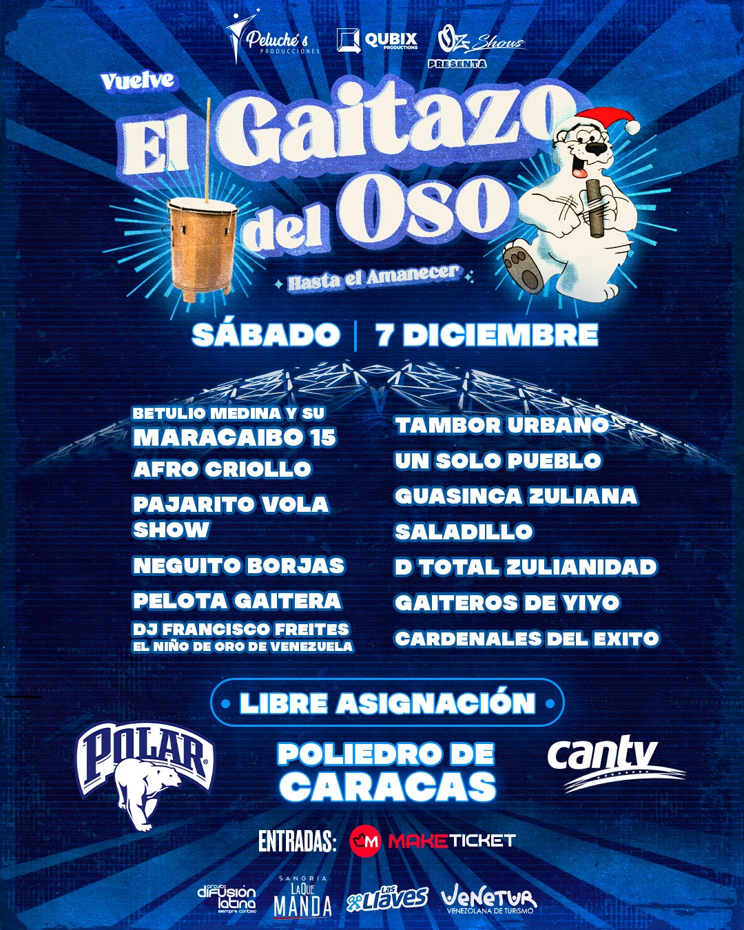 “El Gaitazo del Oso”, que estará bajo la producción de Qubix Productions (@qubixproductions), Oz Show (@ozshows) y con el sello Peluche Producciones (@peluchesproducciones), reunirá en la misma tarima a: Betulio Medina y su Maracaibo 15, Afro Criollo, Pajarito Vola Show, Neguito Borjas, Pelota Gaitera, Tambor Urbano, Un Solo Pueblo, Guasinca Zuliana, Saladillo, Cardenales del éxito, Gaiteros de Yiyo y D Total Zulianidad, mientras que la musicalización previa a cada presentación estará a cargo de “El niño de oro de Venezuela”, Dj Francisco Freites.