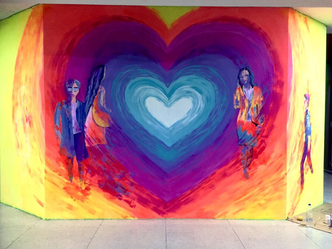 La obra es un corazón de colores vivos como amarillo, naranja, magenta, violeta y azul turquesa combinados entre ellos, en el que entran y salen personas, y lo atraviesa la palabra LOVE, escrito muy delgadamente que simula el hilo.